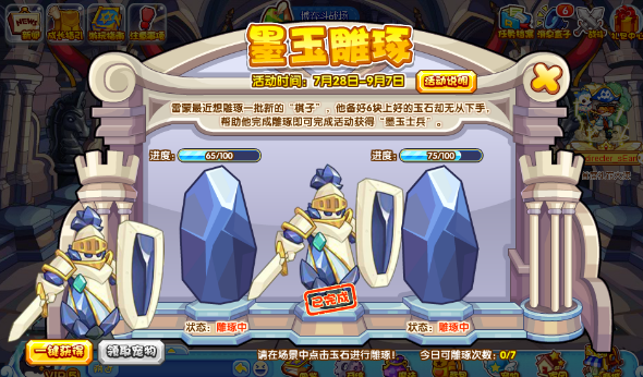系统设有三块独立玉石雕刻项目,每块需积累100点进度值方可激活。建议采用集中突破策略,优先完成单块玉石雕刻以降低操作复杂度。每日首次雕刻建议使用满配资源组合,后续根据剩余进度灵活调整资源配置。