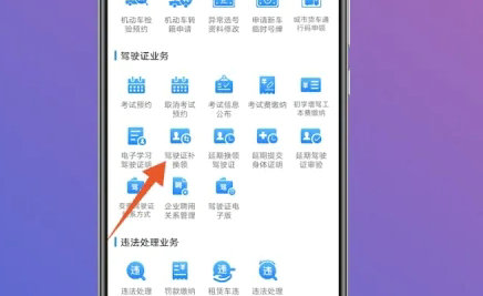 2、滑动至"驾驶证业务"模块,选择"驾驶证补换领"功能入口。系统将自动检测当前证件状态,若显示"可办理期满换证"方可继续操作