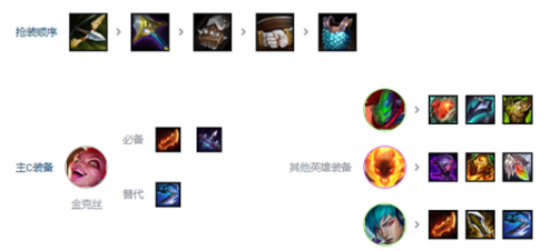 1、装备优先级:核心输出金克丝必备鬼索的狂暴之刃(持续攻速叠加)与最后的轻语(破防效果),替代方案可选巨人杀手(对抗高血量单位)。前排潘森优先配置石像鬼板甲/救赎,锤石适配离子火花等团队增益装备。