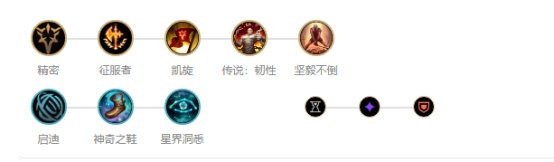 精密系选择征服者作为基石符文,通过技能连招快速叠加层数获得自适应之力。凯旋增强残血反杀能力,传奇韧性有效应对控制阵容,坚毅不倒则在低血量时提供额外伤害加成。启迪系点出神奇之鞋节省经济开支,星界洞悉带来的召唤师技能冷却缩减,可使闪现等重要技能更快就绪。