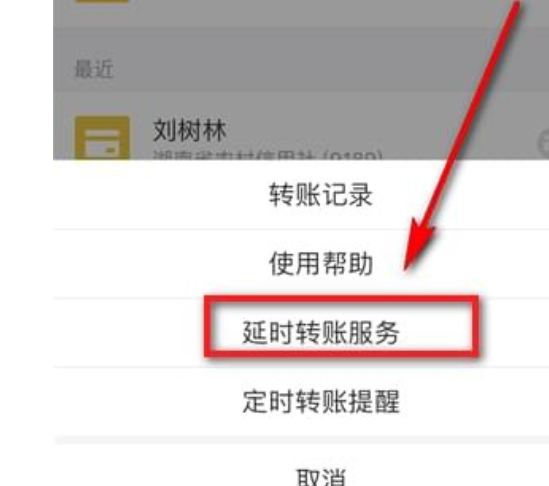 3、在展开的二级菜单中,选择带有时钟图标的【延迟转账服务】选项。该功能支持2小时与24小时两种延时模式,系统默认显示最近使用过的方案。