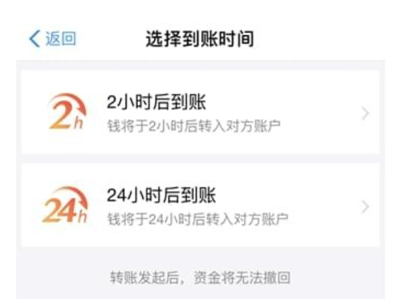 4、根据实际需求勾选【2小时后到账】或【24小时后到账】。建议大额转账选择24小时模式,小额测试可选择较短时效,转账过程中可随时返回修改延时设置。