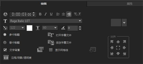 属性面板提供字间距(0-200%)、行距(单倍至三倍)、对齐方式(九宫格定位)等专业排版功能,支持创建多语言双语字幕。