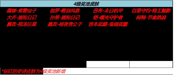 初始1-3级奖池包含二十余款热门史诗皮肤,涵盖多个英雄职业类型。当玩家累计刷新达到指定次数后,可激活4级高级奖池,该层奖池特别加入年度限定皮肤与传说皮肤碎片等珍稀奖励。