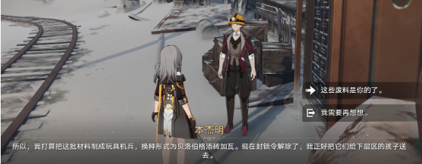 完成全部四组材料回收后,开拓者将收到来自佩拉的加密通讯。此时需返回造物之柱东南侧跨区桥梁,在标注为红色小圈的位置与本杰明进行最终对话。该角色将透露收集材料用于制造儿童娱乐装置的暖心计划,对话结束瞬间即可达成成就解锁条件。