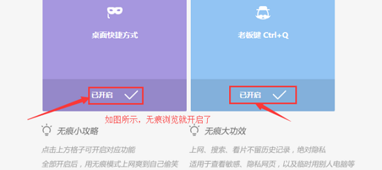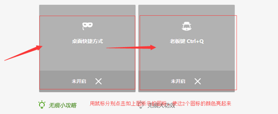 3、点击展开快捷设置面板后,可见"桌面快捷方式"与"老板键"两个功能模块。前者用于创建无痕模式专用入口,后者支持通过自定义快捷键(默认Ctrl+Shift+N)快速激活隐私浏览。需同时开启两项功能以确保完整隐私保护体系。